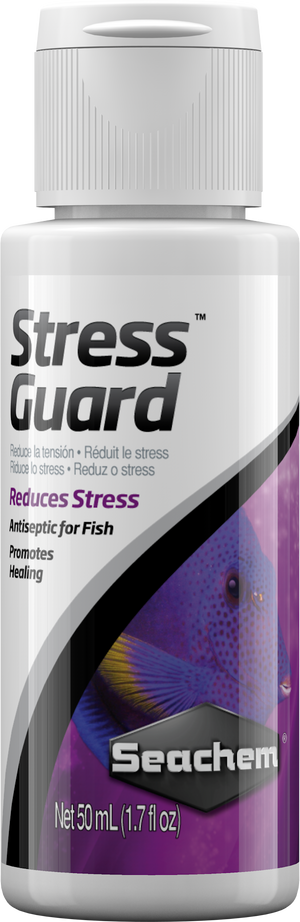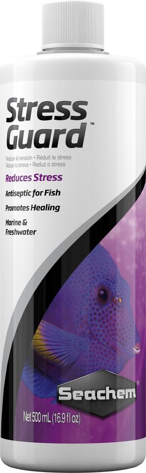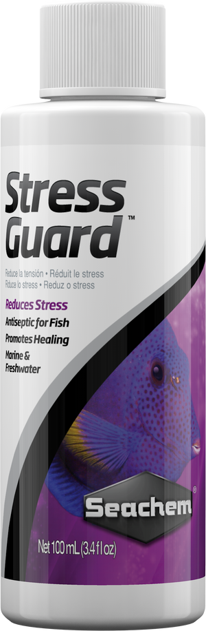What makes StressGuard™ very successful at healing is the fact that it contains protein active colloids. This protein active colloidal agent actively seeks out any wounds, abrasions, or places where exposed proteins are and attaches to this area to help directly deliver the disinfectant in the product and start the healing process. This protein active colloid, because it binds to the exposed proteins, also acts like a liquid bandage to the abrasion. Some products are marketed to be squirted in the bag when a fish is purchased. Those products are generally acidic, with some brands being a very strong acid. Putting such a product in a small, enclosed container with a fish often does more harm than any intended good. StressGuard™ has a pH of 7.0. It will not affect the pH of an aquarium, even at large doses. There are no other products on the market that can compare to the effectiveness of StressGuard™.